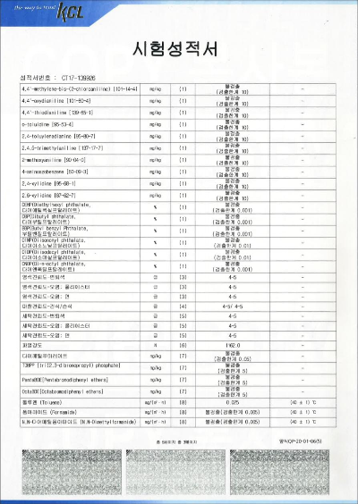 - 난방이 가동 중인 실내나 차량 내부와 같이 덥고 밀폐된 공간에서도 유해물질을 방출하지 않아 안전합니다. 휘발성 유기화합물 시험 결과, 40℃ 조건에서 이루어지는 표준적인 시험에서 어린이용품 안전기준을 통과하였으며, 80℃ 고온 조건에서도 기준을 충족했습니다.